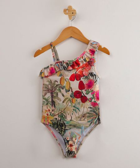 Maiô infantil feminino confeccionado em malha com proteção uv50+ e estampa de natureza com folhagem, frutas e a flor de jambo. A modelagem é assimétrica com uma alça fina e outra alça larga. Possui aplicação de babado no decote. Tem forro em malha.