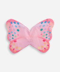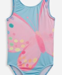 Maiô infantil confeccionado em malha com proteção uv e estampa de borboleta. A peça tem modelagem reta, caimento ajustado ao corpo, maior cobertura na parte posterior, decote redondo e alças largas. Acompanha asa de borboleta removível.