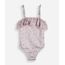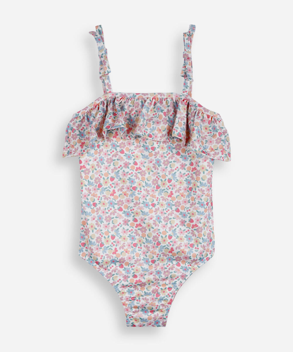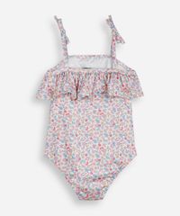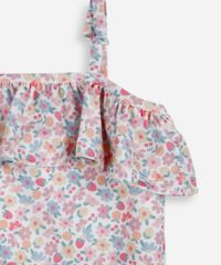 Maiô infantil confeccionado em malha de poliéster com elastano que oferece proteção UV. A peça tem modelagem reta e caimento ajustado ao corpo. Possui alças finas com laços decorativos, decote reto e busto com babado aplicado. Estampa com padronagem de motivos florais e acabamento pespontado.