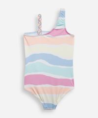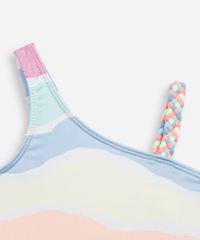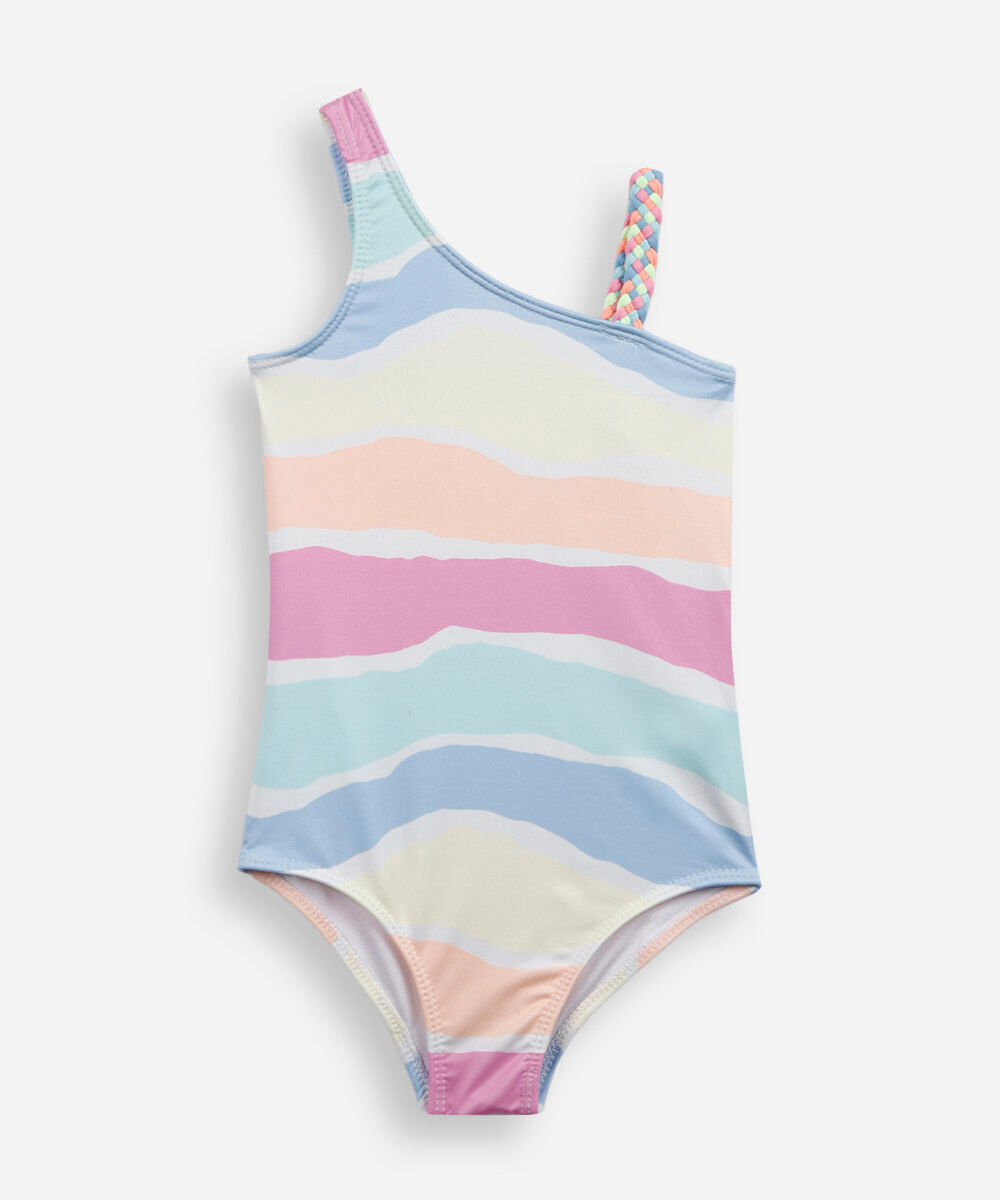 Maiô infantil confeccionado em malha com proteção 50+fps uva e uvb. A peça possui decote reto, alças médias e uma com detalhe trançado, padronagem listrada, forro e acabamento pespontado.