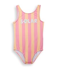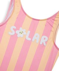 Maiô infantil confeccionado em malha com toque leve e proteção UV+ com padronagem listrada. A peça possui modelagem justa ao corpo com decote frontal redondo e decote em U nas costas, alças médias, estampa frontal localizada com a palavra escrita "Solar", forro interno e acabamento pespontado.
