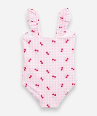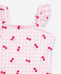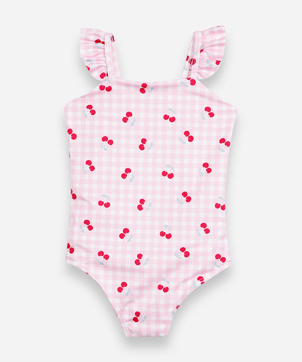 Maiô infantil confeccionado em malha com proteção uv com padronagem vichy e cerejas. A peça possui decote reto, alças finas com babados, caimento confortavelmente justo ao corpo, forro e acabamento pespontado. Composição: 90% poliéster 10% elastano Instruções de lavagem: - Lavar à temperatura máxima de 40ºC - Proibido o alvejamento - Não secar em tambor - Secagem em varal à sombra - Passar à temperatura média - Limpeza à úmido, processo normal