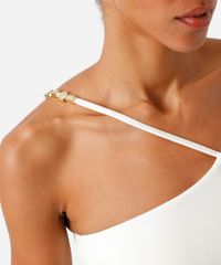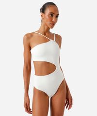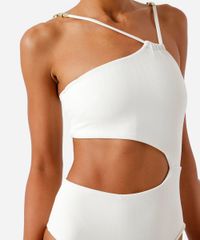 Maiô confeccionado em malha texturizada com proteção UV. A peça possui caimento ajustado ao corpo, detalhe de recorte na lateral, decote franzido, alças finas com aviamento geométricos em metal com banho dourado, bojo removível, forro e acabamento pespontado. Composição: 94% poliamida, 6% elastano Modelo veste: P/38 Medidas da modelo: Altura: 1,73m Busto: 86cm Cintura: 70cm Quadril: 101cm. Instruções de lavagem: - Lavagem manual - Não alvejar - Não secar em secadora - Secar na horizontal - Não passar - Não lavar à seco - Não limpar à úmido