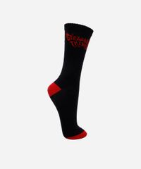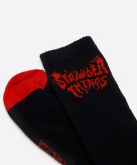 Par de meias confeccionadas em malha com algodão e estampa temática da série Stranger Things. O modelo á cano alto com caimento ajustado aos pés e acabamento canelado na parte superior.