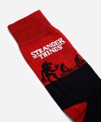 Par de meias confeccionadas em malha com algodão e estampa temática da Stranger Things. Os modelos são cano alto, com caimento ajustado e acabamento canelado na parte superior.