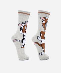 Par de meias confeccionada em malha com algodão e estampa temática dos personagens "Tom e Jerry". O modelo é cano alto, com caimento ajustado e acabamento canelado na parte superior. Composição: 70% algodão, 16% poliéster, 14% outras fibras Instruções de lavagem: - Temperatura até 40º - Não alvejar - Não secar em secadora - Secar na vertical - Não passar - Não lavar a seco - Limpar a úmido