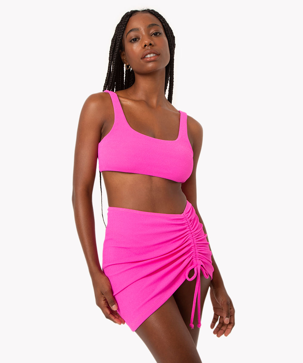 Complete seu look de moda praia com esta saia curta, uma peça que une estilo e funcionalidade para os dias de sol. Seu design moderno com detalhe franzido é perfeito para quem busca um visual despojado e atual. Confeccionada em malha texturizada, ela proporciona um caimento confortável e um toque macio à pele.
