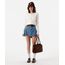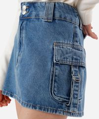 Minissaia feminina confeccionada em jeans. A peça tem modelagem cargo com caimento levemente solto ao corpo. O modelo tem cintura média, cós com passantes para cinto e fechamento por zíper e botão. Possui dois bolsos cargo aplicados nas laterais. Detalhe de acabamento pespontado na barra.