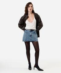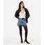 Minissaia feminina confeccionada em jeans. A peça tem modelagem reta com caimento levemente ajustado ao corpo. O modelo tem cintura baixa, cós com passantes para cinto e fechamento por zíper e botão. Possui dois bolsos deslocados frontais e posteriores . Detalhe de acabamento a fio na barra.