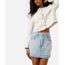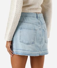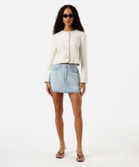 Minissaia feminina confeccionada em jeans. A peça tem modelagem reta com caimento levemente ajustado ao corpo. O modelo tem cintura média, cós com passantes para cinto e fechamento por zíper e botão. Possui três bolsos frontais, dois aplicados na parte posterior e acabamento a fio na barra.