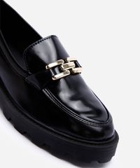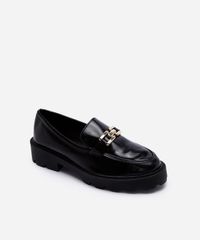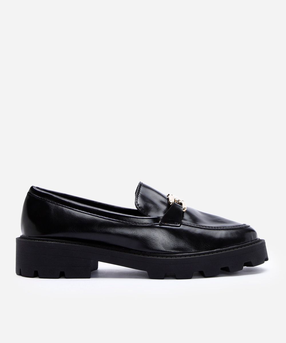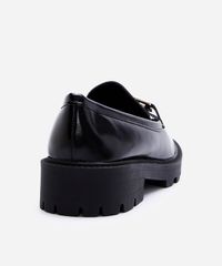 Mocassim masculino desenvolvido em material sintético resistente. O modelo tem bico redondo e cabedal liso, com fivela decorativa aplicada e acabamento pespontado. Possui palmilha macia com inscrição de marca e sola flatform tratorada que auxilia no caminhar.
