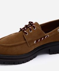 Mocassim masculino desenvolvido em material sintético resistente com textura de camurça. O modelo tem bico redondo e cabedal com ilhoses, cadarço para ajuste, e acabamento pespontado. Possui palmilha macia com inscrição de marca e sola tratorada que auxilia no caminhar.