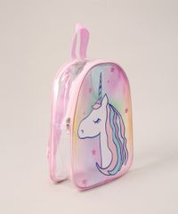 Mochila infantil feminina confeccionada em material sintético com leve brilho e transparência. A peça tem estampa frontal com unicórnio. O modelo é arredondado e possui duas alças posteriores. O fechamento é feito por zíper de metal.