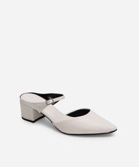 Mule scarpin feminino confeccionado em material sintético resistente. O modelo tem bico fino, cabedal com recorte em V, tira fina com fivela para ajuste e forro interno. Possui solado macio com inscrição de marca, salto groso médio e sola texturizada que auxilia no caminhar.