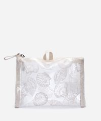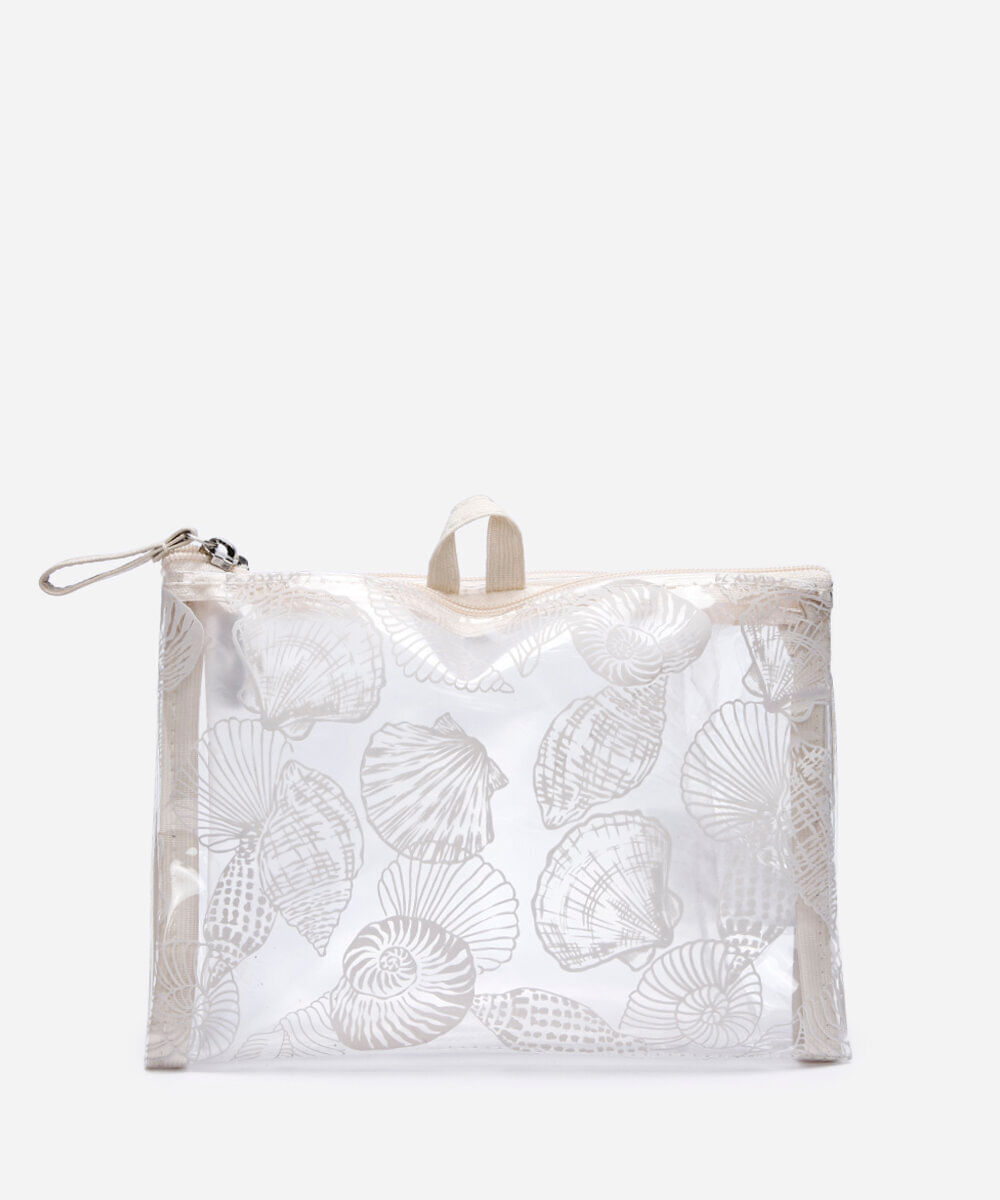 Necessaire produzida em material sintético com estampa temática de conchas. A peça possui formato quadrado, compartimento duplo com fechamento por botão de pressão, transparência, alça prática para pendurar, acabamento pespontado e fechamento principal por zíper.