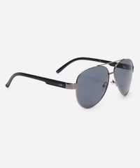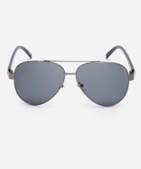 Óculos de sol desenvolvido em metal resistente na cor cinza chumbo, formato aviador e as extremidades arredondadas. A lente na cor cinza, a ponte em U e plaquetas embutidas. Com proteção da lente UVA e UVB.
