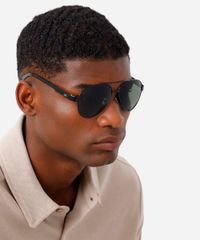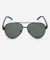 Óculos de sol masculino desenvolvido em metal resistente na cor preta com formato aviador e as extremidades arredondadas. A lente na cor cinza, a ponte em U e plaquetas embutidas. Com proteção da lente UVA e UVB.