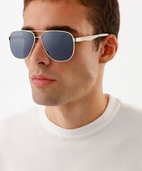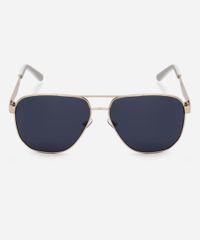 Óculos de sol masculino desenvolvido em metal resistente na cor dourada, formato aviador com as extremidades arredondadas. A lente na cor cinza, a ponte em U e plaquetas embutidas. Com proteção da lente UVA e UVB.