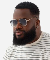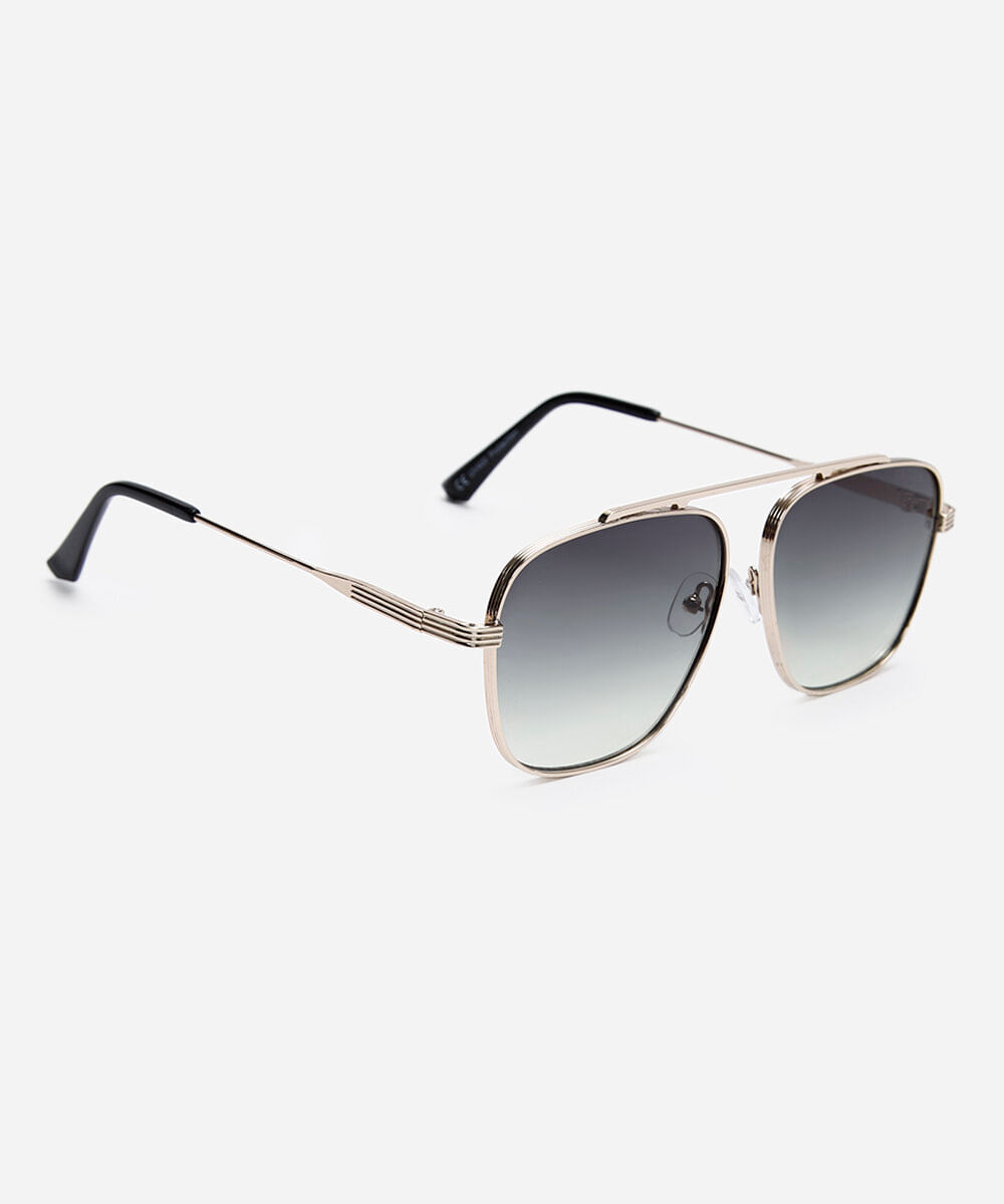 Óculos de sol desenvolvido em metal resistente na cor dourada, com formato aviador e as extremidades arredondadas. A lente na cor verde, a ponte em U e plaquetas embutidas. Com proteção da lente UVA e UVB.