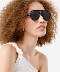 Óculos de sol desenvolvido em acetato resistente na cor preta, formato aviador e as extremidades arredondadas. A lente na cor cinza, a ponte em U e plaquetas embutidas. Com proteção da lente UVA e UVB.