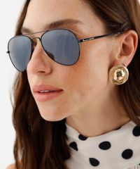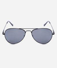 Óculos de sol desenvolvido em metal resistente na cor preta, com formato aviador e as extremidades arredondadas. A lente na cor cinza, a ponte em U e plaquetas embutidas. Com proteção da lente UVA e UVB.