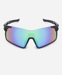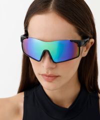 Óculos de sol desenvolvido em acetato resistente na cor azul, com formato geométrico e as extremidades arredondadas. A lente na cor azul espelhada, a ponte em U e plaquetas embutidas. Com proteção da lente UVA e UVB.