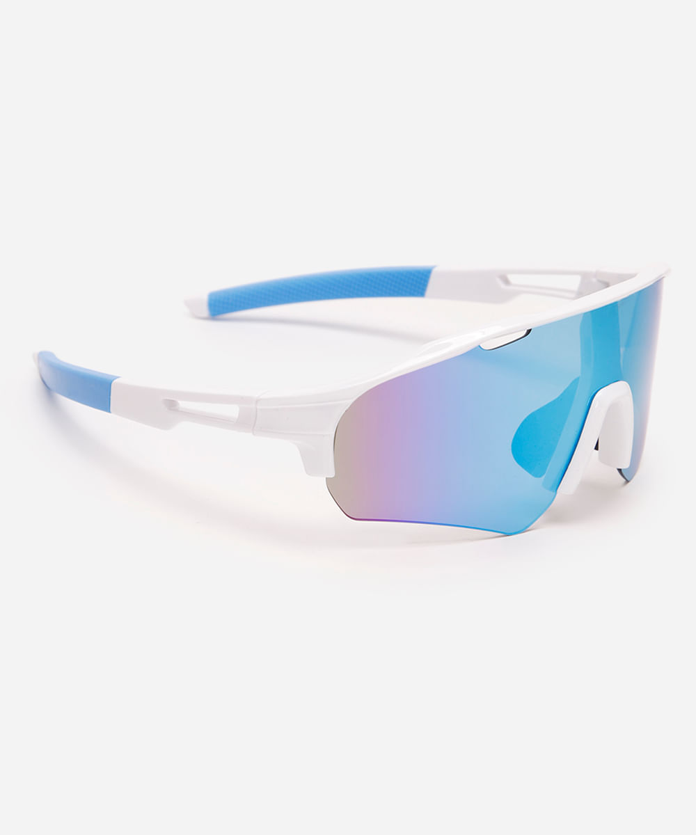 Óculos de sol esportivo unissex desenvolvido em acetato resistente na cor azul com formato geométrico orgânico com as extremidades arredondadas. Lente na cor azul, a ponte em U e plaquetas embutidas. Com proteção da lente UVA e UVB.