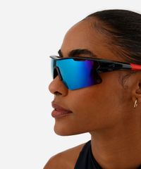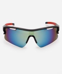 Óculos de sol esportivo unissex desenvolvido em acetato resistente na cor preta e vermelha com formato geométrico com as extremidades arredondadas. A lente colorida com efeito espelhado, a ponte em U e plaquetas embutidas. Com proteção da lente UVA e UVB.