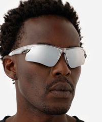 Óculos de sol esportivo unissex desenvolvido em acetato resistente transparente com formato geométrico com as extremidades arredondadas. A lente prateada com efeito espelhado, a ponte em U e plaquetas embutidas. Com proteção da lente UVA e UVB.