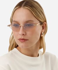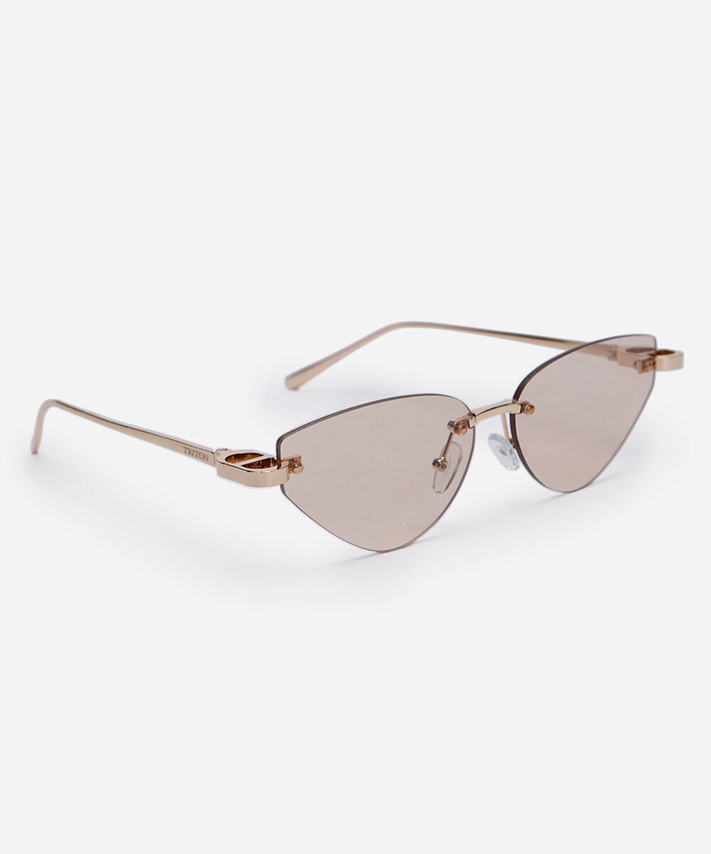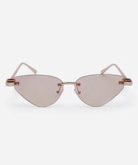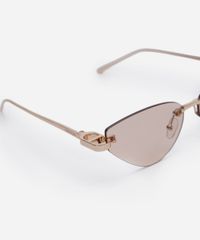 Óculos de sol feminino desenvolvido em metal resistente na cor dourada com formato gatinho e as extremidades arredondadas. A lente na cor marrom, a ponte em U e plaquetas embutidas. Com proteção da lente UVA e UVB.