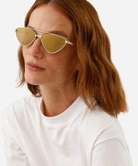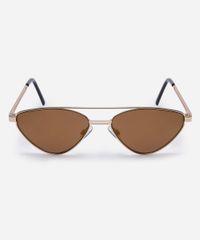 Óculos de sol desenvolvido em metal resistente na cor dourada, com formato gatinho e as extremidades arredondadas. A lente na cor marrom, a ponte em U e plaquetas embutidas. Com proteção da lente UVA e UVB.