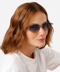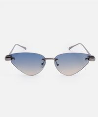 Óculos de sol desenvolvido em metal resistente na cor prateada, com formato gatinho e as extremidades arredondadas. A lente na cor azul, a ponte em U e plaquetas embutidas. Com proteção da lente UVA e UVB.