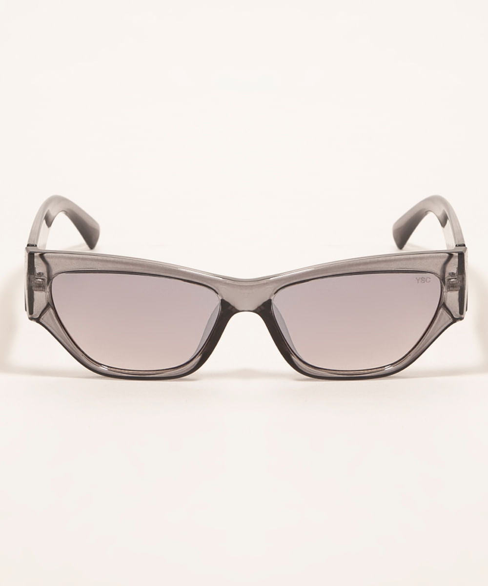 Esse óculos foi feito em acetato maleável e resistente com o formato gatinho. A lente é espelhada na cor cinza, a ponte é em U e as plaquetas são embutidas. A proteção da lente é UVA e UVB.