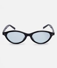 Óculos de sol desenvolvido em acetato resistente na cor preta, com formato oval e as extremidades arredondadas. A lente na cor azul, a ponte em U e plaquetas embutidas. Com proteção da lente UVA e UVB.