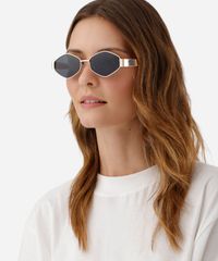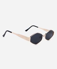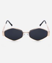 Óculos de sol feminino desenvolvido em metal resistente na cor dourada com formato oval e as extremidades arredondadas. A lente na cor cinza, a ponte em U e plaquetas embutidas. Com proteção da lente UVA e UVB.