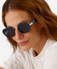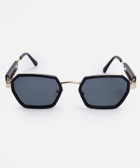 Óculos de sol desenvolvido em metal resistente na cor dourada, com formato oval e as extremidades arredondadas. A lente na cor cinza, a ponte em U e plaquetas embutidas. Com proteção da lente UVA e UVB.