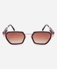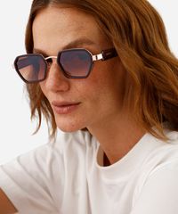 Óculos de sol desenvolvido em metal resistente na cor dourada, com formato oval e as extremidades arredondadas. A lente na cor marrom, a ponte em U e plaquetas embutidas. Com proteção da lente UVA e UVB.