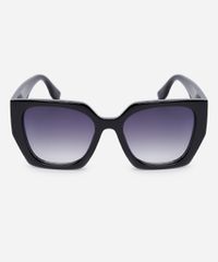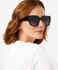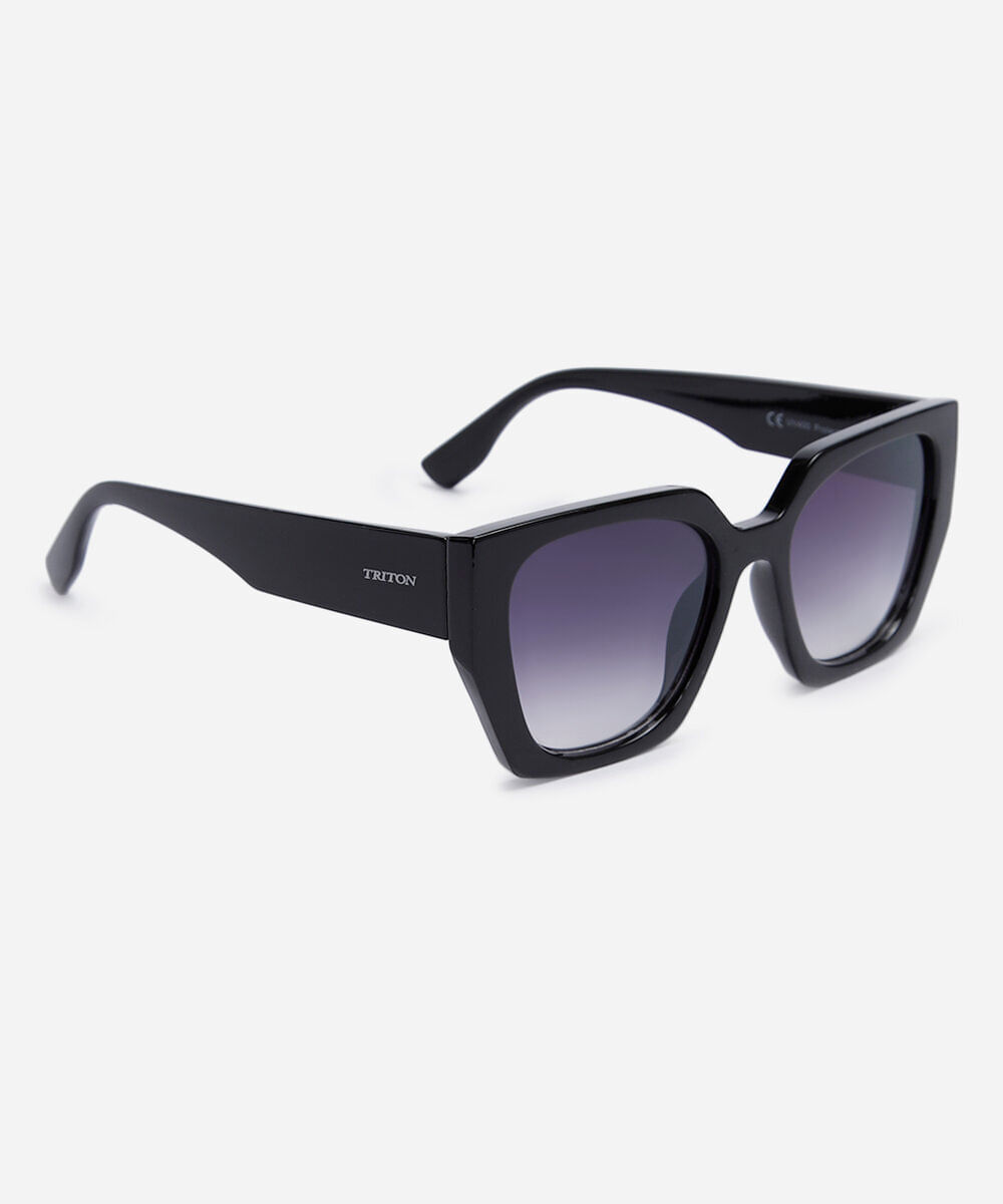 Óculos de sol desenvolvido em acetato resistente na cor preta, com formato quadrado e as extremidades arredondadas. A lente na cor cinza degradê, a ponte em U e plaquetas embutidas. Com proteção da lente UVA e UVB.