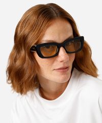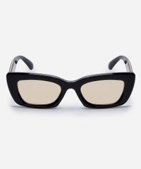Óculos de sol desenvolvido em acetato resistente na cor preta, com formato quadrado e as extremidades arredondadas. A lente na cor marrom claro, a ponte em U e plaquetas embutidas. Com proteção da lente UVA e UVB.