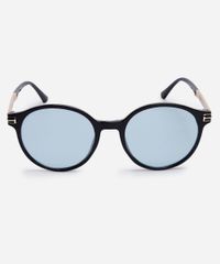 Óculos de sol desenvolvido em acetato resistente na cor preta, com formato redondo e as extremidades arredondadas. A lente na cor azul, a ponte em U e plaquetas embutidas. Com proteção da lente UVA e UVB.