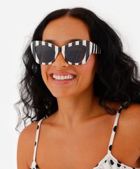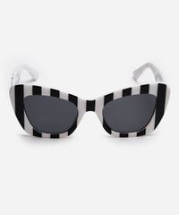 Óculos de sol de carnaval desenvolvido em acetato resistente nas cores preto e branco formando padronagem listrada, formato gatinho e as extremidades arredondadas. A lente na cor cinza, a ponte em U e plaquetas embutidas. Com proteção da lente UVA e UVB.