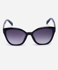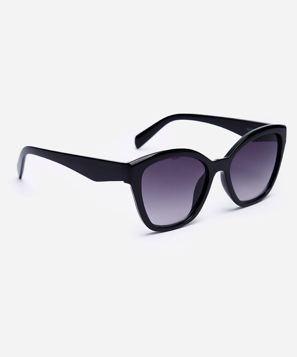 Óculos de sol desenvolvido em acetato resistente na cor preta, com formato gatinho e as extremidades arredondadas. A lente na cor cinza degradê, a ponte em U e plaquetas embutidas. Com proteção da lente UVA e UVB.