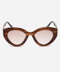 Óculos de sol desenvolvido em acetato resistente na cor marrom com efeito tartaruga, com formato gatinho e as extremidades arredondadas. A lente na cor marrom, a ponte em U e plaquetas embutidas. Com proteção da lente UVA e UVB.