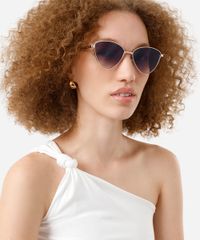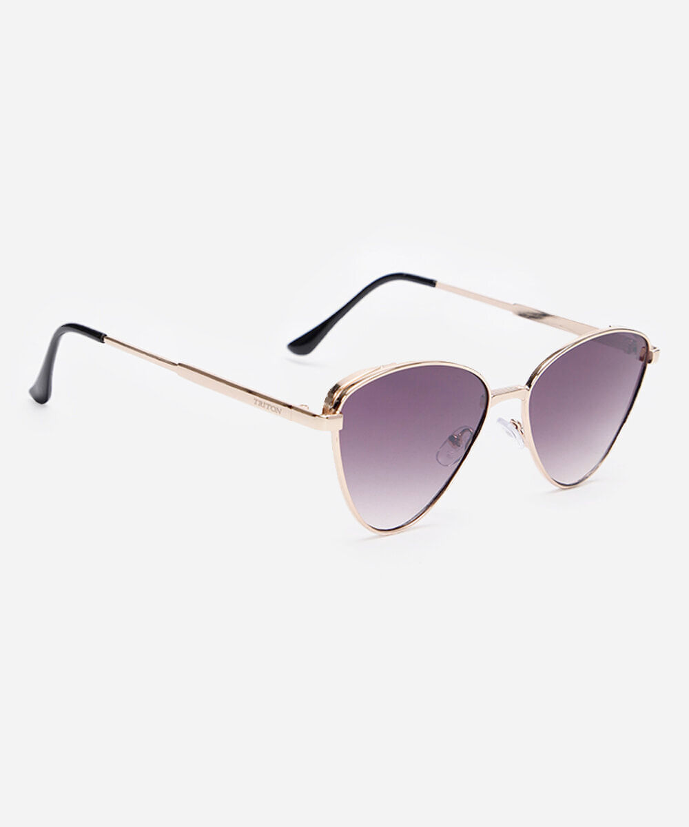 Óculos de sol desenvolvido em metal resistente na cor dourada, com formato gatinho e as extremidades arredondadas. A lente na cor cinza degradê, a ponte reta e plaquetas embutidas. Com proteção da lente UVA e UVB.