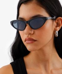 Óculos de sol desenvolvido em acetato resistente na cor preta, com formato gatinho e as extremidades arredondadas. A lente na cor cinza, a ponte em U e plaquetas embutidas. Com proteção da lente UVA e UVB.