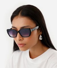 Óculos de sol desenvolvido em acetato resistente na cor preta, com formato gatinho e as extremidades arredondadas. A lente na cor cinza, a ponte em U e plaquetas embutidas. Com proteção da lente UVA e UVB.