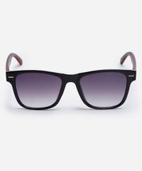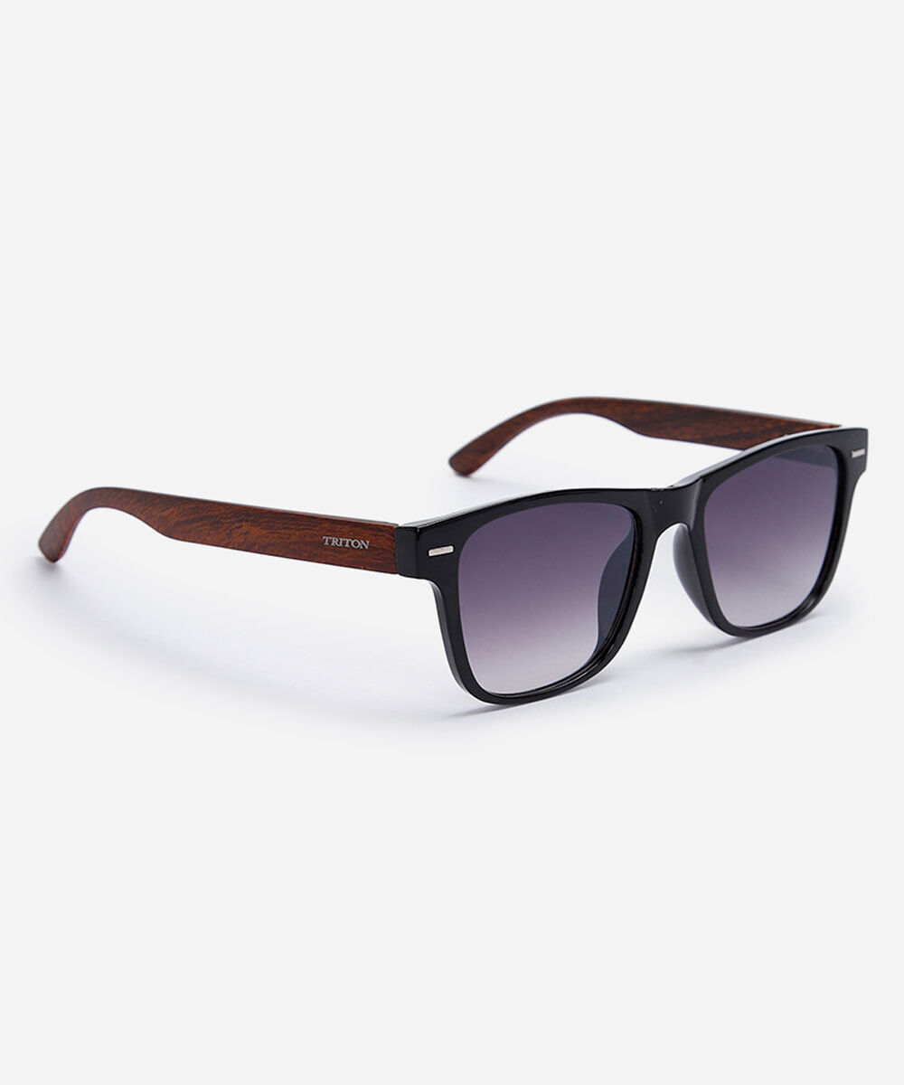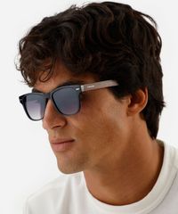 Óculos de sol masculino desenvolvido em acetato resistente na cor preta e hastes com efeito amadeirado, formato quadrado com as extremidades arredondadas. A lente na cor cinza com efeito degradê, a ponte em U e plaquetas embutidas. Com proteção da lente UVA e UVB.
