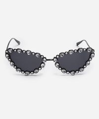 Óculos de sol feminino desenvolvido em metal resistente na cor preta, formato gatinho com as extremidades arredondadas. Detalhe de strass ao redor das lentes. A lente na cor cinza, a ponte em U e plaquetas embutidas. Com proteção da lente UVA e UVB.