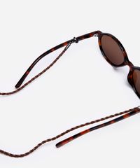 Óculos de sol desenvolvido em acetato resistente na cor marrom com efeito tartaruga com formato oval e as extremidades arredondadas. Lente na cor marrom, ponte em U e plaquetas embutidas. Com proteção da lente UVA e UVB. Acompanha cordinha trançada.