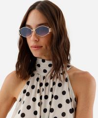 Óculos de sol desenvolvido em metal resistente na cor dourada, com formato oval e as extremidades arredondadas. A lente na cor cinza degradê, a ponte em U e plaquetas embutidas. Com proteção da lente UVA e UVB. A Triton é uma marca de óculos brasileira com mais de 40 anos, especializada no mercado ótico, tem o propósito de levar modelos de acessórios: óculos de sol, óculos de grau e óculos clipon personalizados para o público masculino, feminino e infantil.